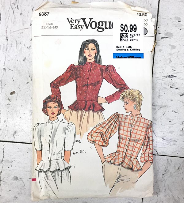 I liked this peplum top pattern that seem like it’s from the 1980s. In particular, I like C version with the large puffy sleeves.